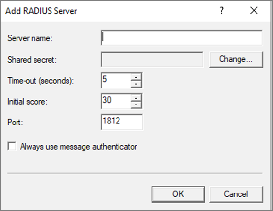 - On the Add RADIUS Server window, enter the details of the RADIUS server and click OK.