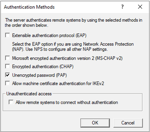 Note: The VPN client used should also be configured to use PAP to match what is configured in RRAS.